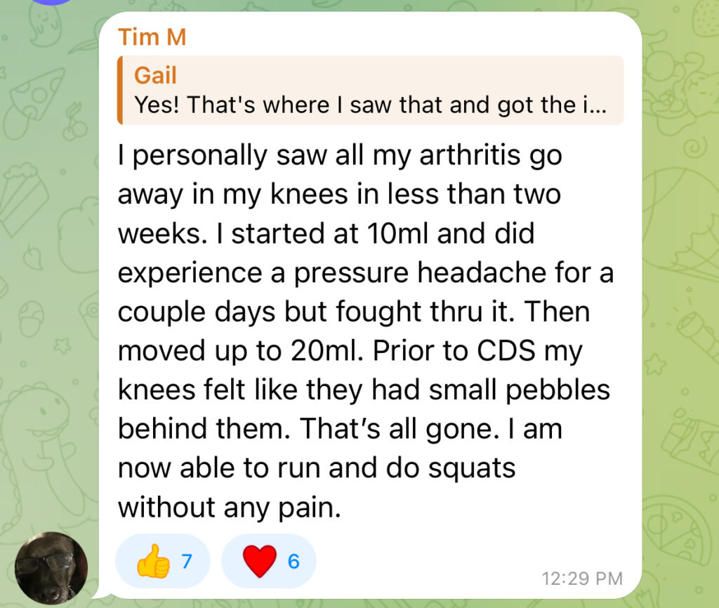 “I personally saw all my arthritis go away in my knees in less than two weeks. I started at 10ml and did experience a pressure headache for a couple days but fought thru it. Then moved up to 20ml. Prior to CDS my knees felt like they had small pebbles behind them. That’s all gone. I am now able to run and do squats without any pain.”