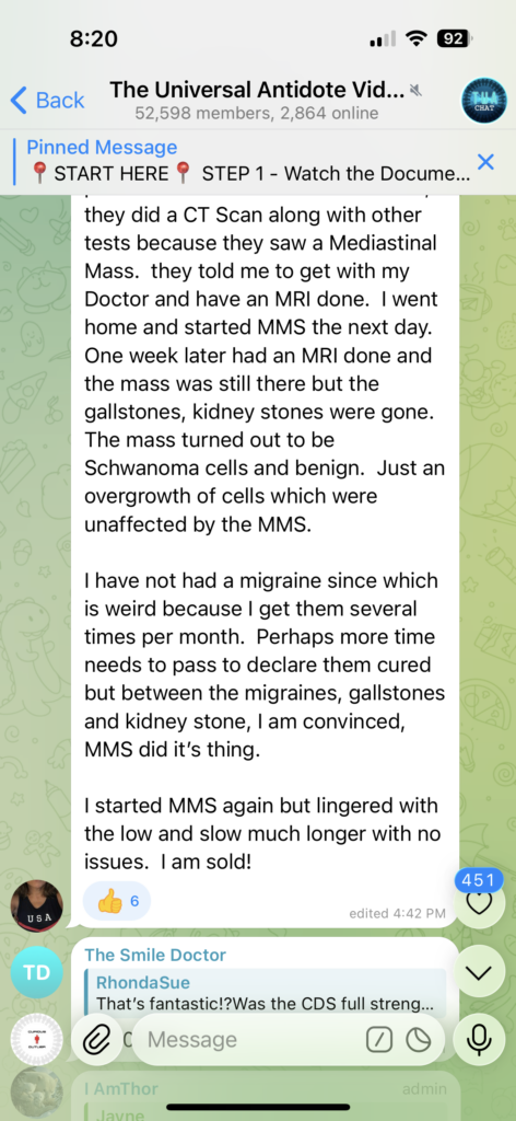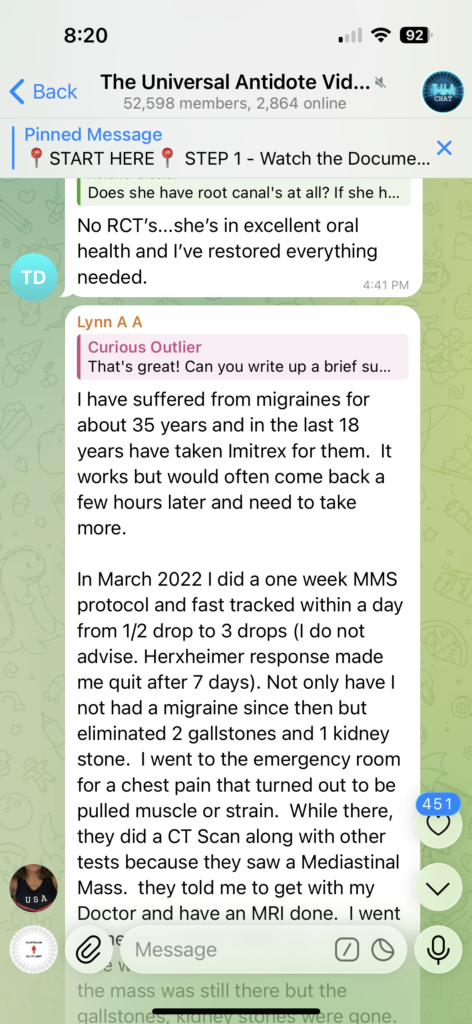 In March 2022 I did a one week MMS protocol and fast tracked within a day from 1/2 drop to 3 drops (I do not advise. Herxheimer response made me quit after 7 days). Not only have I not had a migraine since then but eliminated 2 gallstones and 1 kidney stone. I went to the emergency room for a chest pain that turned out to be pulled muscle or strain. While there, they did a CT Scan along with other tests because they saw a Mediastinal Mass. they told me to get with my Doctor and have an MRI done. I went home and started MMS the next day. One week later had an MRI done and the mass was still there but the gallstones, kidney stones were gone. The mass turned out to be Schwanoma cells and benign. Just an overgrowth of cells which were unaffected by the MMS.