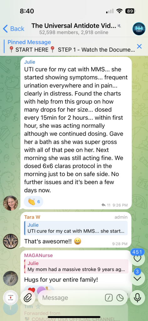 “UTI cure for my cat with MMS… she started showing symptoms… frequent urination everywhere and in pain… clearly in distress. Found the charts with help from this group on how many drops for her size… dosed every 15min for 2 hours… within first hour, she was acting normally although we continued dosing. Gave her a bath as she was super gross with all of that pee on her. Next morning she was still acting fine. We dosed 6×6 claras protocol in the morning just to be on safe side. No further issues and it’s been a few days now.”