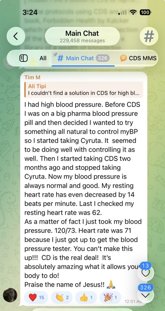 “I had high blood pressure. Before CDS I was on a big pharma blood pressure pill and then decided I wanted to try something all natural to control myBP so I started taking Cyruta. It seemed to be doing well with controlling it as well. Then I started taking CDS two months ago and stopped taking Cyruta. Now my blood pressure is always normal and good. My resting heart rate has even decreased by 14 beats per minute. Last I checked my resting heart rate was 62.