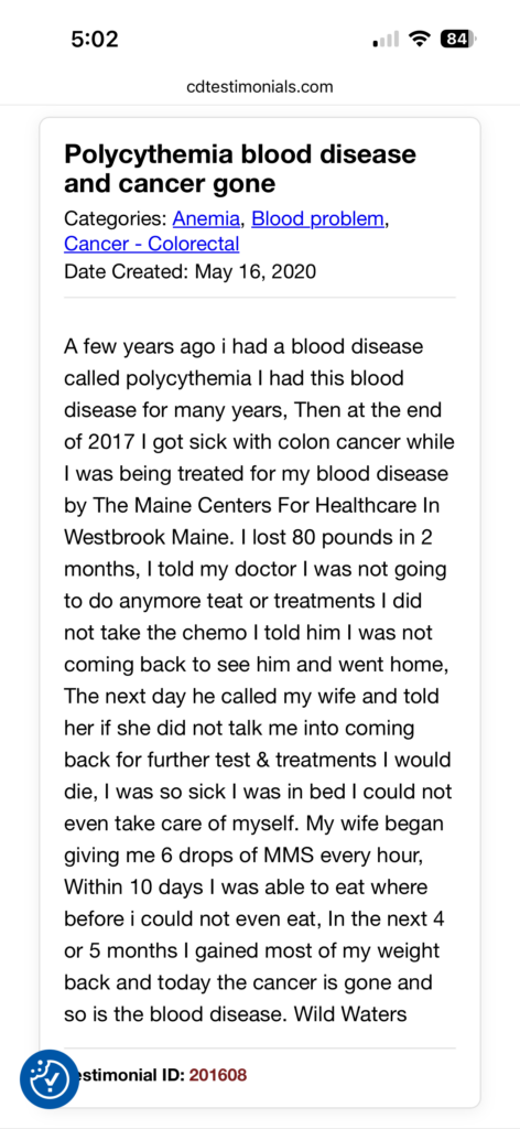 “…I had a blood disease called polycythemia I had this blood disease for many years, Then at the end of 2017 I got sick with colon cancer while I was being treated for my blood disease by The Maine Centers For Healthcare In Westbrook Maine. I lost 80 pounds in 2 months, I told my doctor I was not going to do anymore teat or treatments I did not take the chemo I told him I was not coming back to see him and went home, The next day he called my wife and told her if she did not talk me into coming back for further test & treatments I would die, I was so sick I was in bed I could not even take care of myself. My wife began giving me 6 drops of MMS every hour, Within 10 days I was able to eat where before i could not even eat, In the next 4 or 5 months I gained most of my weight back and today the cancer is gone and so is the blood disease.