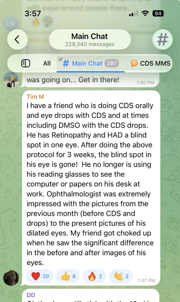 “I have a friend who is doing CDS orally and eye drops with CDS and at times including DMSO with the CDS drops. He has Retinopathy and HAD a blind spot in one eye. After doing the above protocol for 3 weeks, the blind spot in his eye is gone!  He no longer is using his reading glasses to see the computer or papers on his desk at work. Ophthalmologist was extremely impressed with the pictures from the previous month (before CDS and drops) to the present pictures of his dilated eyes. My friend got choked up when he saw the significant difference in the before and after images of his eyes.”