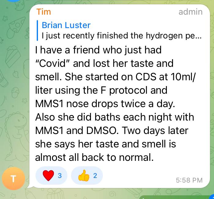 “I have a friend who just had “Covid” and lost her taste and smell. She started on CDS at 10ml/liter using the F protocol and MMS1 nose drops twice a day. Also she did baths each night with MMS1 and DMSO. Two days later she says her taste and smell is almost all back to normal.